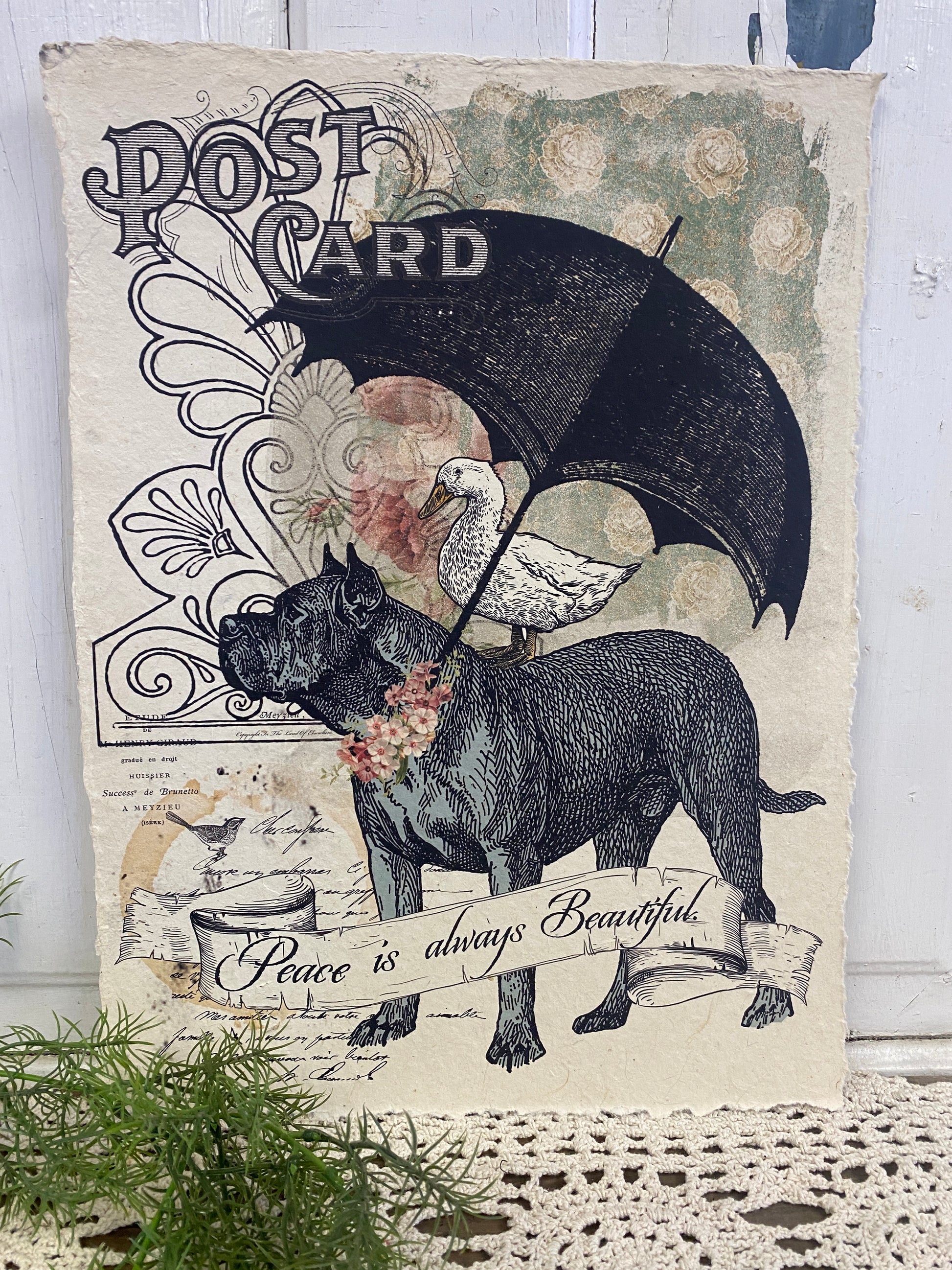12” x 16” These unique images are a combination of artwork, photography and vintage elements to create one-of-a-kind style. Made from tree free seeded paper with hand torn edges.